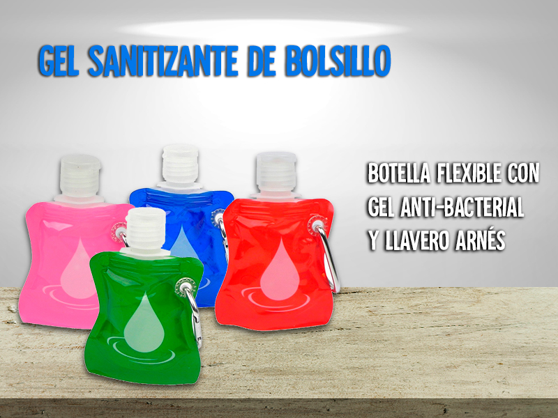 Botella flexible con gel anti-bacterial y Llavero arnés