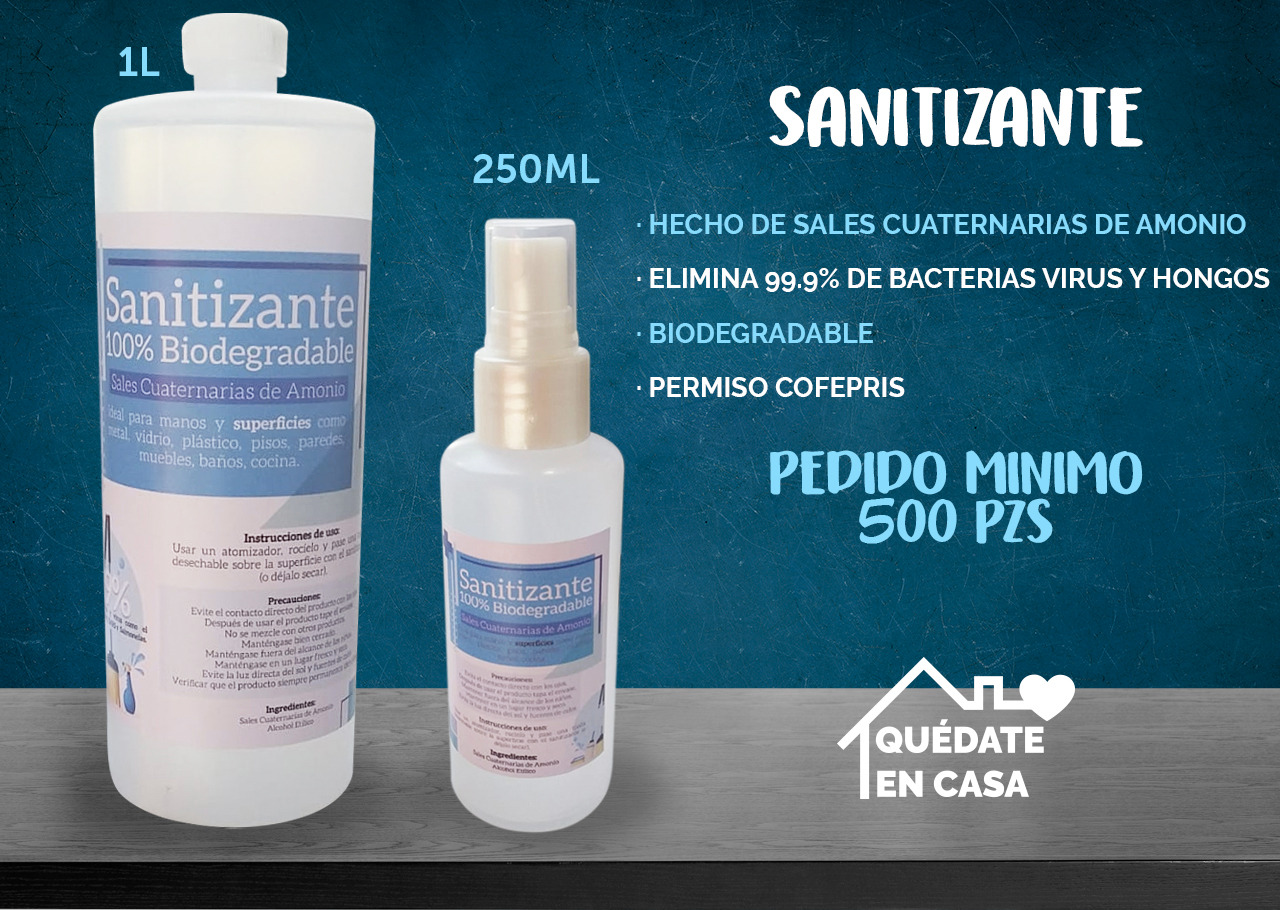 Hecho de sales cuaternarias de amonio. Elimina el 99.9% de virus, bacterias y hongos. Biodegradable. Permiso COFEPRIS Pedido mínimo 500pzs.