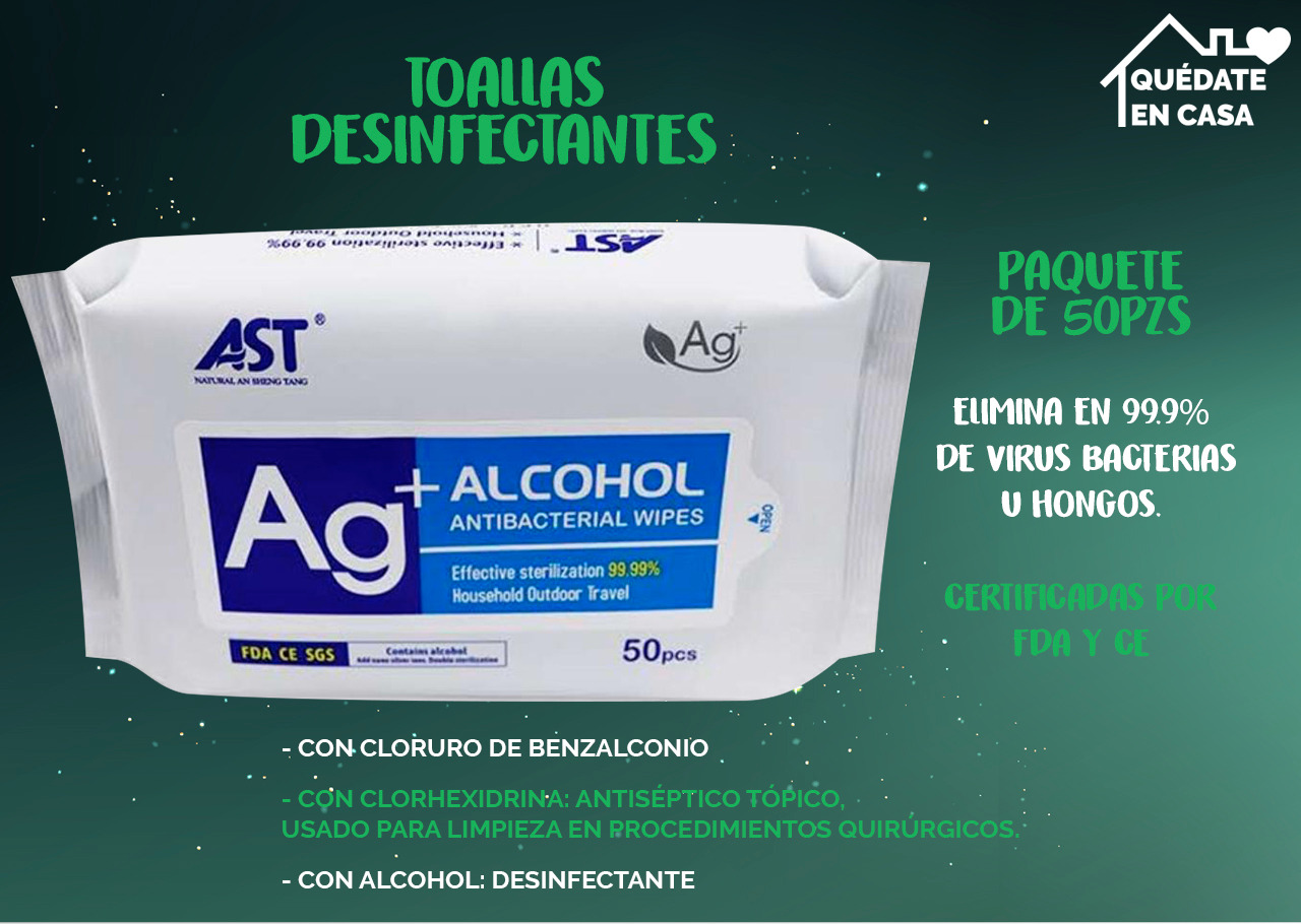 Con cloruro de benzalconio. Con clorhexidrina:antiséptico tópico usado para limpieza en procedimientos quiúrgicos. Con Alcohol desinfectante. Paquete de 50 pzs. Elimina el 99.9% de virus, bacterias y hongos. Certificado FDA Y CE